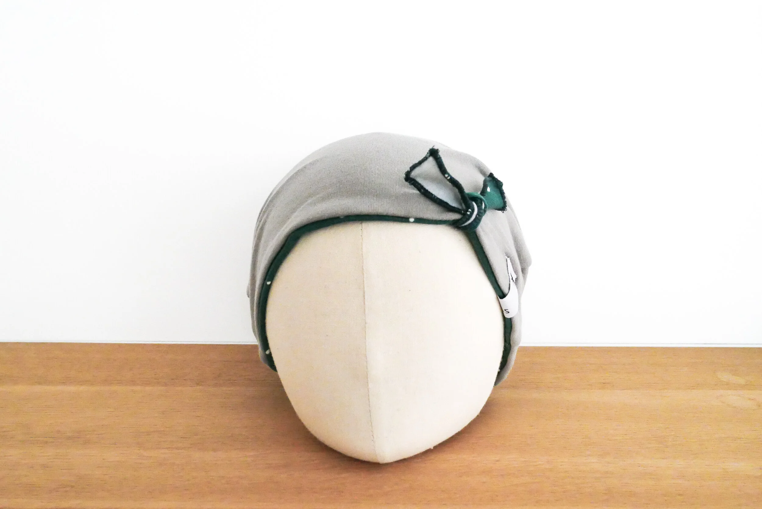 Le beanie réversible avec son petit plus : une fine bande nouée vient retroussée légèrement un côté.
